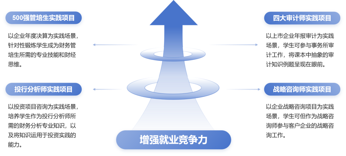 理论与实践相结合,依托四模块理论基础设计四个不同从业方向的实践应用项目,从业方向导师带训实践。学生通过实践应用,引导学生了解财经领域的职场规范和行业动态,提高学生职业素养和竞争力。