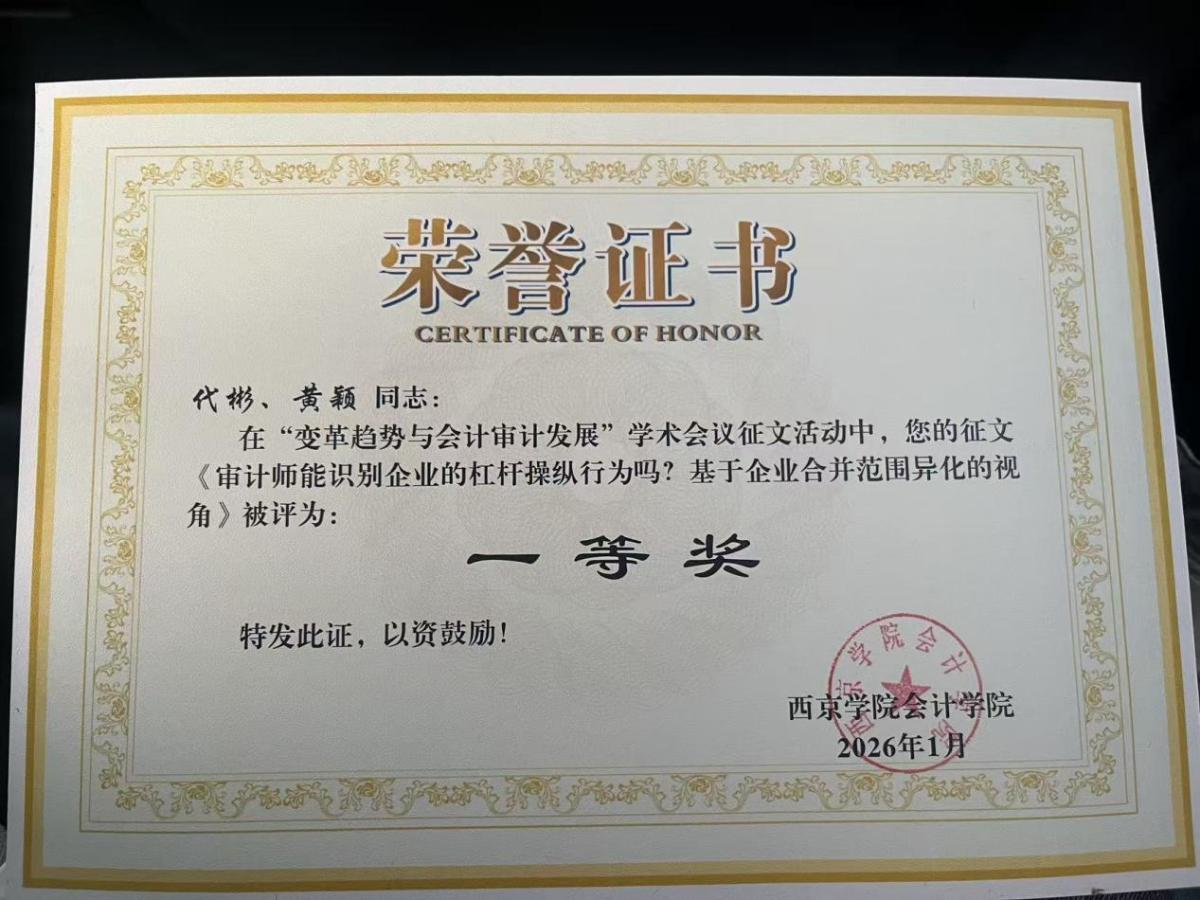 1月10日,由西京学院与现代审计与绩效管理研究中心联合主办的“变革趋势与会计审计演进学术研讨会”在西安召开。我院审计专业研究生黄颖受邀参会作论文报告,并对其他学者参会论文进行了一对一点评。在颁奖仪式上,代彬教授与研究生黄颖合作撰写的论文《审计师能识别企业的杠杆操纵行为吗?——基于企业合并范围异化的视角》荣获优秀论文一等奖。