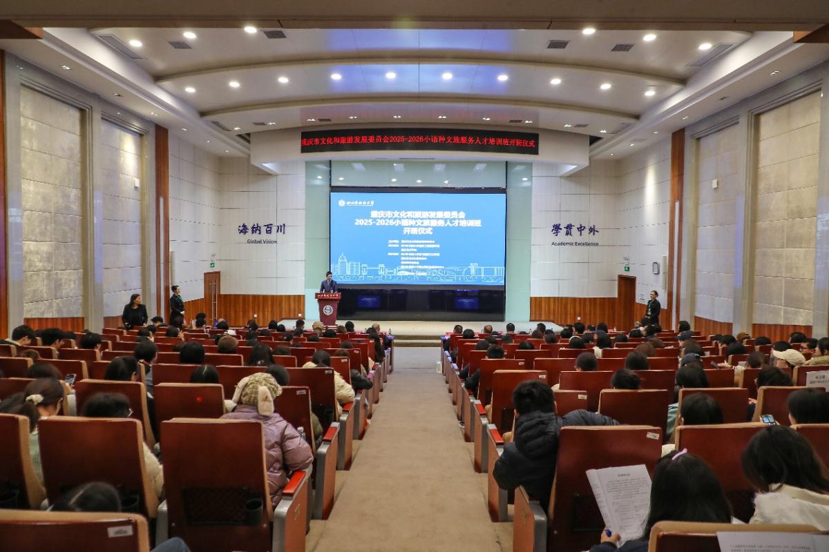11月30日上午,重庆市首期小语种文旅服务人才培训班在我校宏文楼国际报告厅正式开班。该项目由重庆市文化和旅游发展委员会指导,我校国际工商管理学院牵头,联合东方语言文化学院以及重庆艺术学校、重庆市文化和旅游协会、重庆市导游协会等单位共同实施,标志着重庆在系统化培养小语种文旅服务人才方面迈出关键一步。副校长王仁强、重庆市文化和旅游发展委员会副主任朱茂等出席开班仪式。