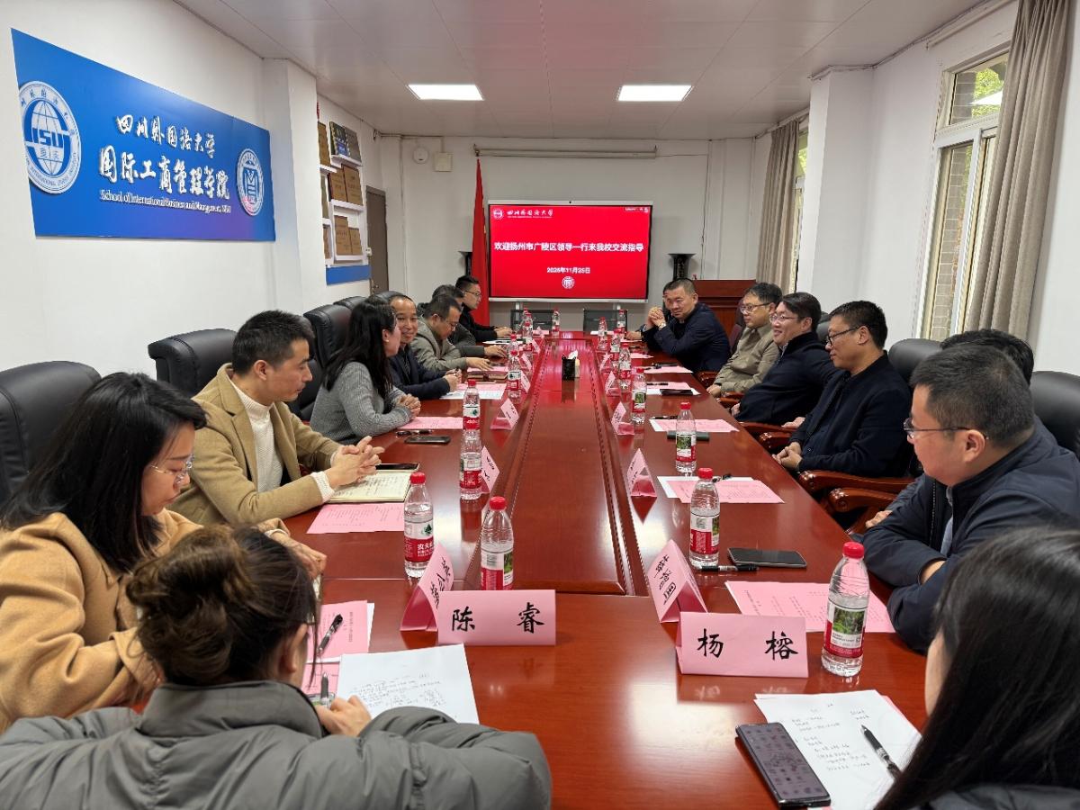 11月25日上午,扬州市广陵区委常委、组织部部长杨勇,扬州市广陵区发改委党委书记、主任刘明辉,武汉万吨冷链集团董事长谭垒,中国中政汇金有限公司董事长易广等一行8人来我院调研交流。学校党委常委、组织部部长彭程,学院党总支书记王婷、院长代彬以及西方语言文化学院、东方语言文化学院、俄语学院、国际金融与贸易学院相关负责人参加了本次交流活动。