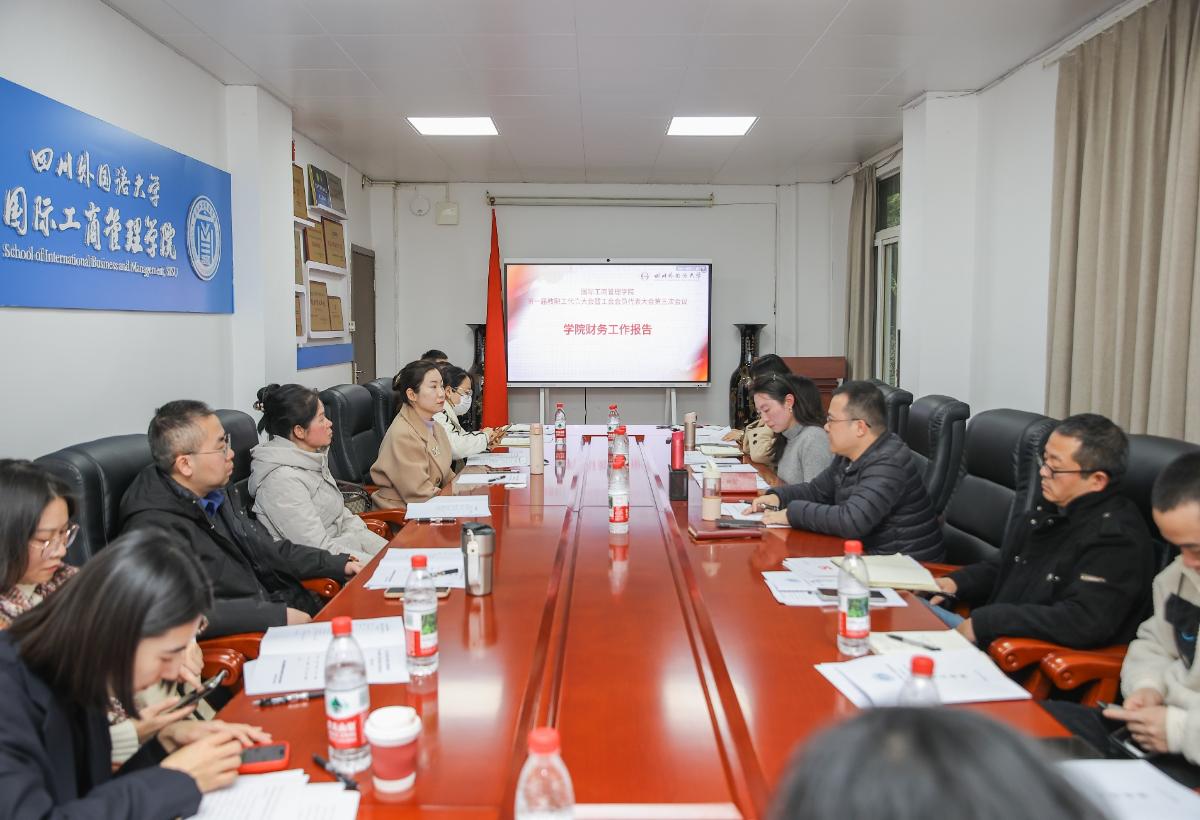 会议的第一项议程是代彬院长作题为《凝心聚力促发展 乘势而上谋新篇》的院长工作报告。代彬院长从本科教学、学科与科研、研究生教学、对外交流与合作等方面对学院2025年的工作进展以及机遇与挑战等方面进行了详细汇报,指出学院将加快构建“服务企业出海”的自主人才培养体系,建成“国际化特色鲜明、数智化支撑有力、产教融合协同高效”的西部一流商学院。他希望全院教职工能够凝心聚力促发展、乘势而上谋新篇,为学院事业高质量发展贡献力量。随后进行了大会第二项议程,代彬院长向与会代表作2025年财务工作报告,对学院本年度的经费来源及支出等财务情况作了专项报告。