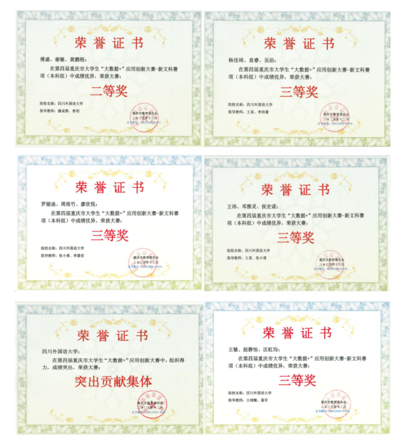 近日,第四届重庆市大学生“大数据+”应用创新大赛(新文科赛项)成绩揭晓。本届大赛吸引了全市500余支队伍同台竞技,我院参赛团队经校赛选拔、市赛激烈角逐脱颖而出,最终荣获二等奖1项、三等奖4项,同时也为学校赢得了“突出贡献集体”荣誉称号,充分彰显了我院在人才培养与创新实践方面取得的新突破与新成效。