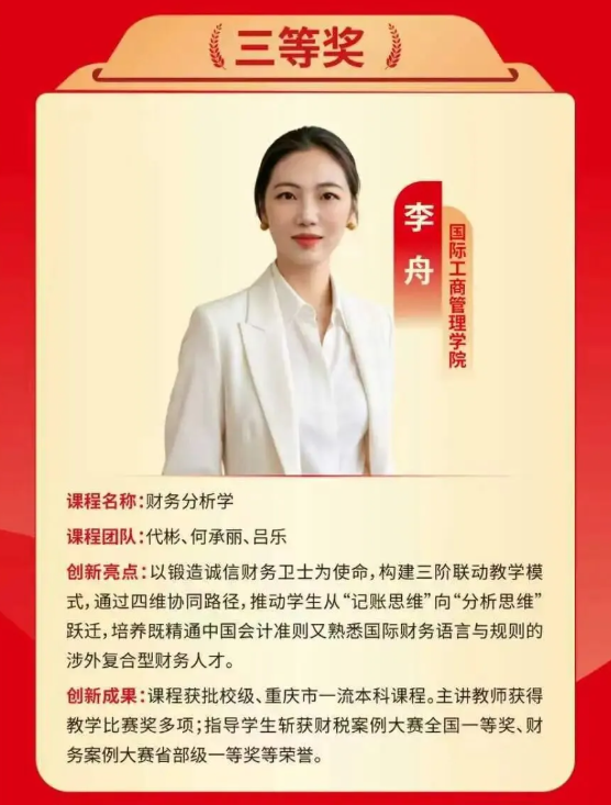 《财务分析学》作为我院财务管理、审计学等专业的核心课程,近年来在教学模式、案例开发及课程思政融合等方面做了持续探索。该团队以学生能力培养为导向,创新性地将数智化工具与国际视野融入财务分析教学,有效提升了课程的高阶性、创新性、挑战度,此次获奖是对其教学创新成果的充分肯定。