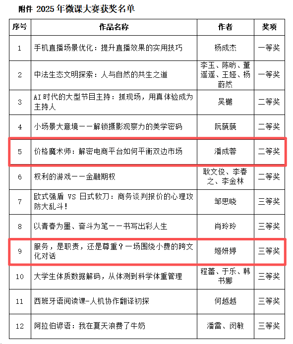 近日,学校教务处公布了2025年重庆市微课大赛校赛选拔获奖名单,我院潘成蓉老师和姬妍婷老师的微课作品分别获得微课大赛校赛二等奖和三等奖的好成绩。