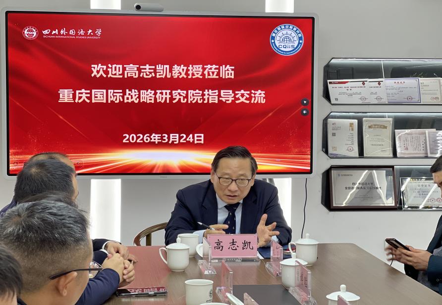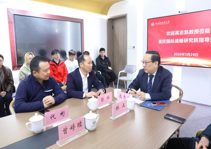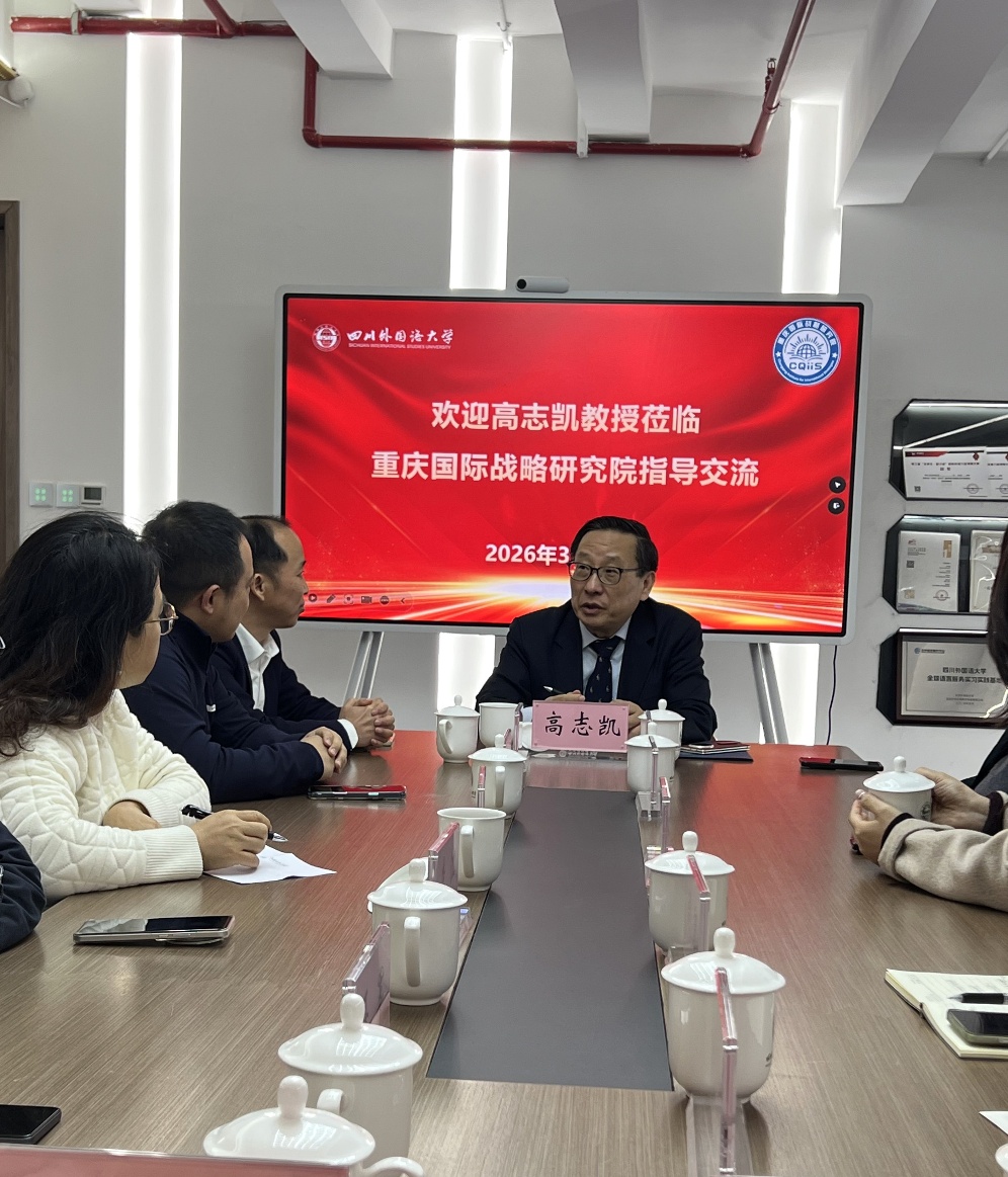 3月24日,全球化智库(CCG)副主任、中国能源安全研究所所长高志凯教授应邀莅临我院交流并指导重庆国际战略研究院的智库建设。党委常委、组织部部长彭程,院长代彬,重庆国际战略研究院研究人员以及学院研究生代表参加了相关交流活动。